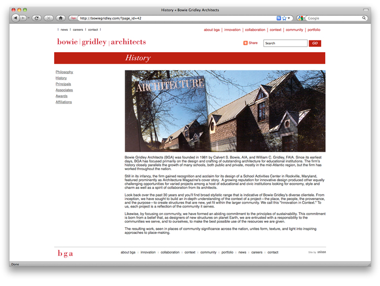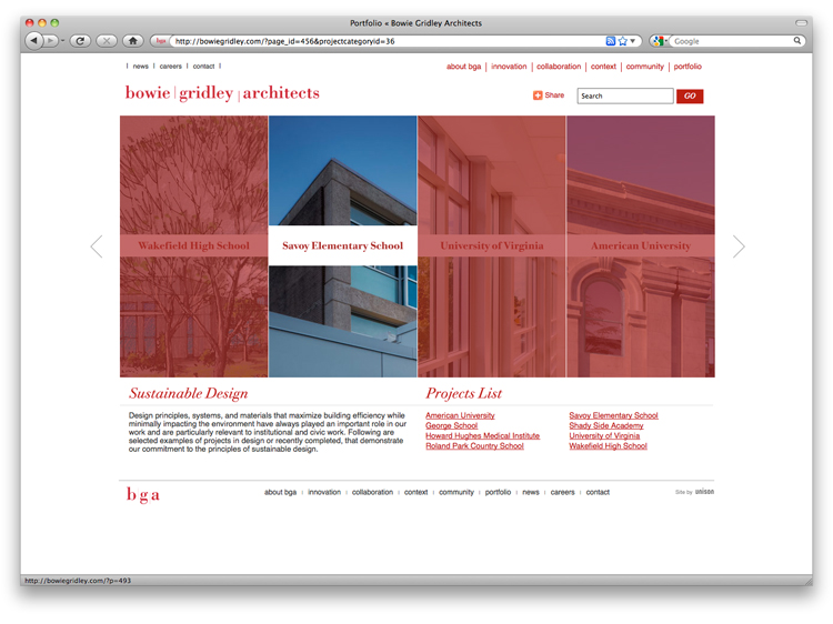 Website for BGA (Bowie Gridley Architects), a prestigious firm with over 30 years experience based in Washington DC. The all-new website filtered their portfolio through 4 major areas of concern: Innovation, Collaboration, Context and Community. Visit the site here.